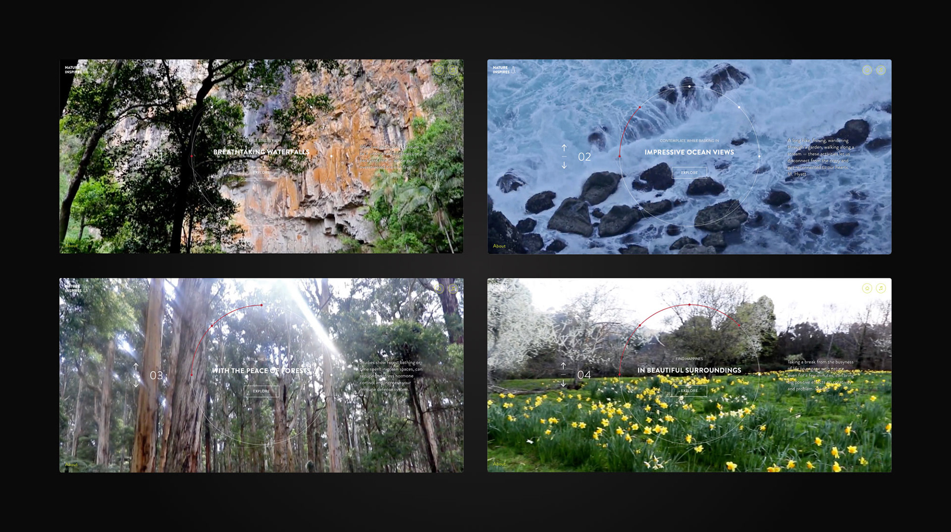 Imagine a therapy that had no known side effects, was readily available, and could improve your overall wellbeing at zero cost. Being in nature or simply viewing scenes of nature can reduce stress, fear and anger or make you feel exhilarated and passionate for life. This interactive web experience discovers the simple beauty of our planet that will leave an inspiration for the future exploration.